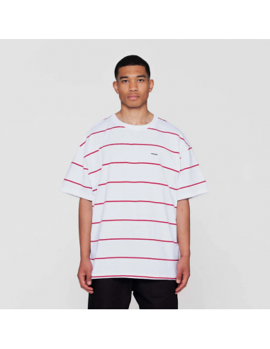 La camiseta de rayas Argyle en blanco. Una camiseta de manga corta y corte extragrande confeccionada con algodón orgánico certificado GOTS. Con cuello redondo de canalé clásico y raya diplomática horizontal por toda la prenda. Detallado con un parche de la marca en el pecho.